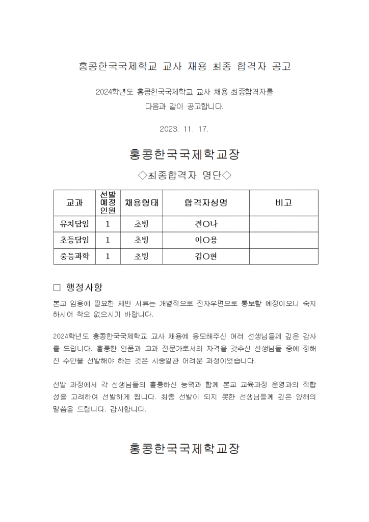 2024학년도 홍콩한국국제학교 교원 채용 최종 합격자 공고