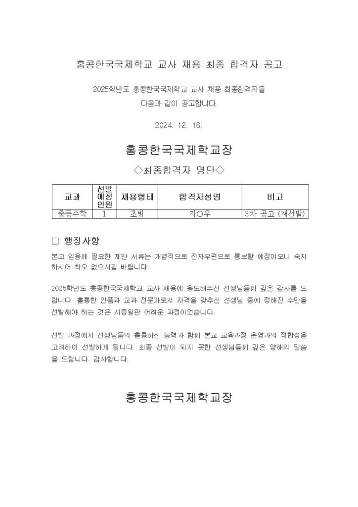 2025학년도 홍콩한국국제학교 교원 채용 최종 합격자 공고(중등 수학)